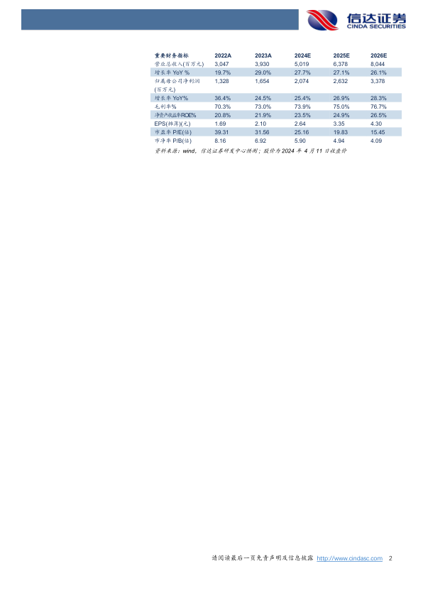 盈利预测:我们预计公司2024-2026年营业收入分别为50.19、63.78、80.44亿元,同比增速分别为27.7%、27.1%、26.1%,实现归母净利润为20.74、26.32、33.78亿元,同比分别增长25.4%、26.9%、28.3%,对应当前股价PE分别为25、20、15倍。