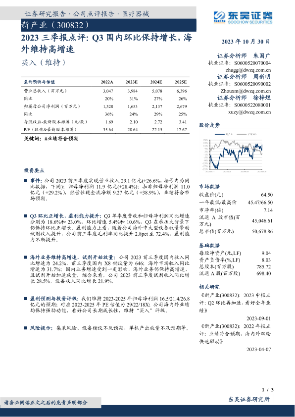 本报告对新产业2023年三季报进行了深入分析,公司Q3业绩环比保持增长,盈利能力不断提升,海外业务维持高增速,试剂开始加速放量。维持对公司2023-2025年盈利预测,看好公司海内外业绩的强劲动能和长期成长性,维持“买入”评级。同时,报告也提示了集采风险、设备铺设不及预期、单机产出放量不及预期等风险。