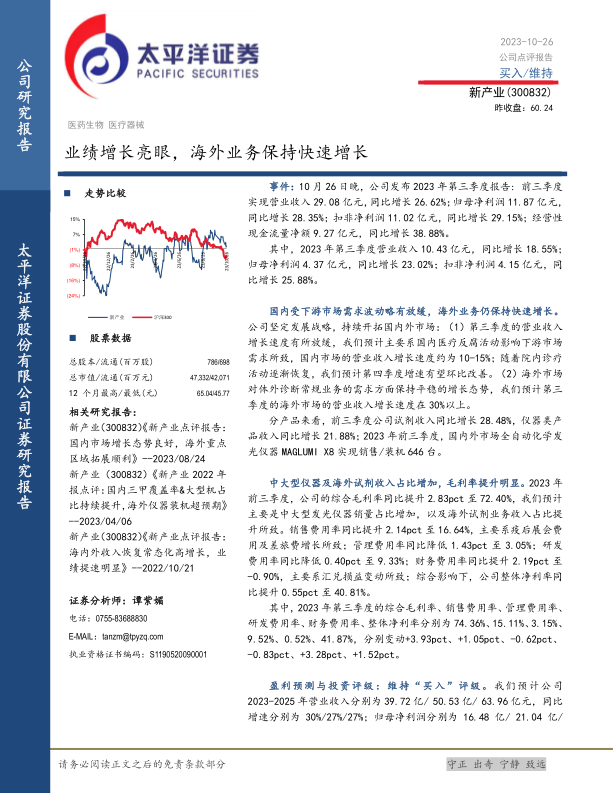 新产业公司在2023年前三季度表现出色,业绩增长主要得益于其国内外市场的积极拓展和产品结构的优化。尽管国内市场受到短期因素影响,但海外市场的强劲增长和中大型仪器的销售提升有效支撑了整体盈利能力。太平洋证券维持“买入”评级,反映了对公司未来发展的信心,但也提示了包括市场风险、政策风险和疫情影响在内的多种潜在风险。