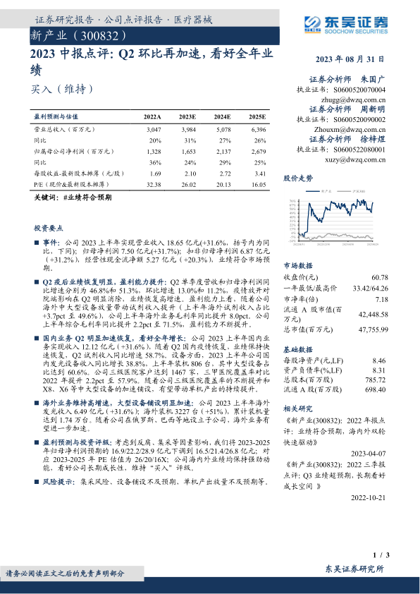 本报告对新产业(300832)2023年中报进行点评,指出公司上半年业绩符合市场预期,Q2业绩恢复明显,盈利能力提升。考虑到反腐、集采等因素影响,下调了2023-2025年归母净利润预期,但公司海内外业绩均保持强劲动能,维持“买入”评级。
