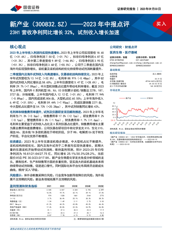 报告维持对新产业的“买入”评级,预计2023-2025年归母净利润分别为16.61亿元、21.64亿元和27.75亿元,同比增长25.1%、30.3%和28.2%。公司作为化学发光免疫分析领域的龙头企业,拥有技术、生产和销售等多重优势,坚实庞大的装机基础将持续带动试剂销售,促进进口替代。同时,国际化和平台化布局将开启新的成长曲线。