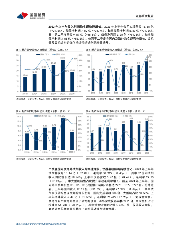 2023年上半年,新产业实现营业收入18.65亿元,同比增长31.6%;归属于母公司股东的净利润为7.50亿元,同比增长31.7%;扣除非经常性损益后的归母净利润为6.87亿元,同比增长31.2%。其中,第二季度表现尤为突出,营收达到9.89亿元,同比增长46.8%;归母净利润3.95亿元,同比增长51.3%;扣非归母净利润3.68亿元,同比增长55.5%。公司在国内外市场均实现强势增长,仪器装机量及装机结构的优化持续带动试剂消耗量提升。