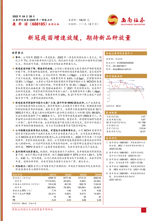 本报告对康希诺2022年一季报进行了全面分析,认为新冠疫苗业务面临挑战,但脑膜炎疫苗管线有望成为新的增长动力。公司长期发展潜力巨大,但同时也面临一定的风险。