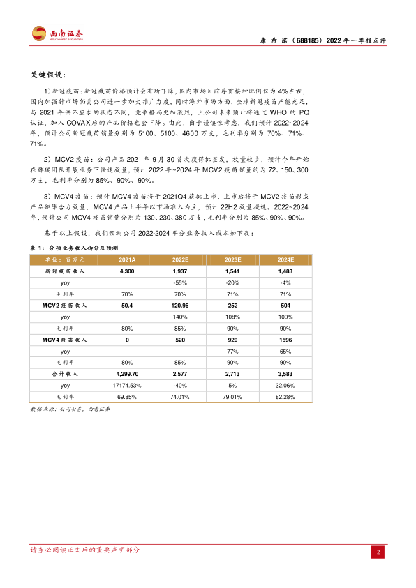 报告提示了MCV系列上市销售低于预期、研发低于预期或研发失败、新冠疫苗未来大幅降价的风险。