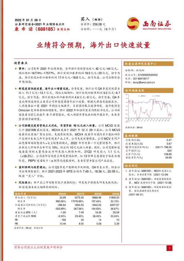 康希诺2021年业绩预告符合预期,新冠疫苗海外放量是业绩增长的主要驱动力。公司脑膜炎疫苗管线正式形成,有望贡献重要收入。同时,公司持续加大研发投入,未来增长潜力可期。维持“买入”评级,但需注意新产品上市、研发以及新冠疫苗降价等风险。