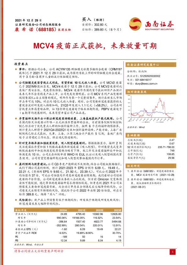 根据公司公告,康希诺的ACYW135群脑膜炎球菌多糖结合疫苗(CRM197载体),即MCV4疫苗,已于2021年12月29日正式获批,成为国内首款上市的四价脑膜炎结合疫苗,主要用于3月龄至3周岁儿童的流行性脑膜炎预防。此举标志着公司脑膜炎疫苗管线正式形成,与此前于2021年9月获批签发的MCV2疫苗共同构成产品矩阵。