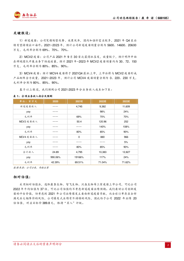 风险提示:新产品上市销售有低于预期风险;研发低于预期或研发失败风险;新冠疫苗未来大幅降价的风险。