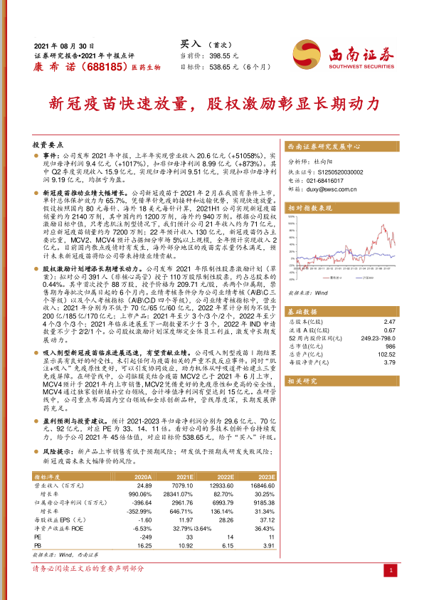 本报告认为,康希诺凭借新冠疫苗的快速放量实现了业绩的爆发式增长。同时,股权激励计划和多元化的产品线为公司未来的发展提供了强劲动力。但同时也提示了新产品上市、研发风险以及新冠疫苗降价的风险。综合来看,给予康希诺“买入”评级,目标价538.65元。