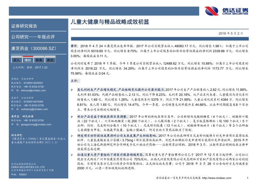 本报告分析了康芝药业2017年及2018年一季度的业绩表现,指出公司在儿童大健康领域的精品战略初见成效,高毛利率自产产品增长稳定,产品结构优化提升了盈利能力。同时,医保目录调整和研发项目的进展也为公司未来发展提供了积极动力。报告维持康芝药业“增持”评级,但提醒投资者关注重大资产重组的不确定性、两票制推进以及市场竞争加剧等风险因素。