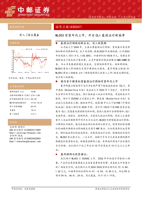 诺思兰德作为基因治疗领域的创新力量,其核心产品NL003(塞多明基注射液)有望于2025年下半年获批上市,开启严重下肢缺血性疾病(CLI)基因治疗的新篇章。面对CLI庞大的患者群体和当前缺乏有效药物治疗的现状,NL003凭借其独特的基因治疗机制和便捷的临床应用,展现出巨大的市场潜力,预计将成为公司未来业绩增长的核心驱动力。尽管公司目前仍处于亏损状态,但NL003的商业化前景为公司带来了广阔的成长空间。中邮证券首次覆盖并给予“买入”评级,但同时提示了药品上市、商业化及政策等方面的潜在风险,建议投资者在把握机遇的同时,保持审慎。