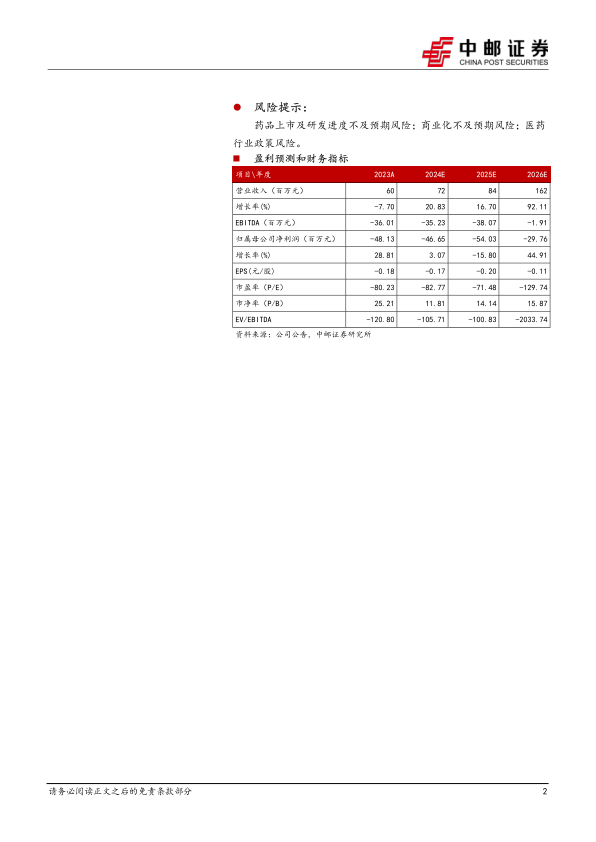 我们预计NL003于2025H2上市,2026年开始逐步贡献收入增量。产品对应患者数量庞大且具备显著临床优势,具备较大开发潜力和广阔成长空间。我们预计公司2024-2026营收分别为0.72、0.84、1.62亿元,归母净利润分别为-0.47、-0.54、-0.30亿元,对应PS分别为54倍、46倍、24倍。首次覆盖,给予“买入”评级。