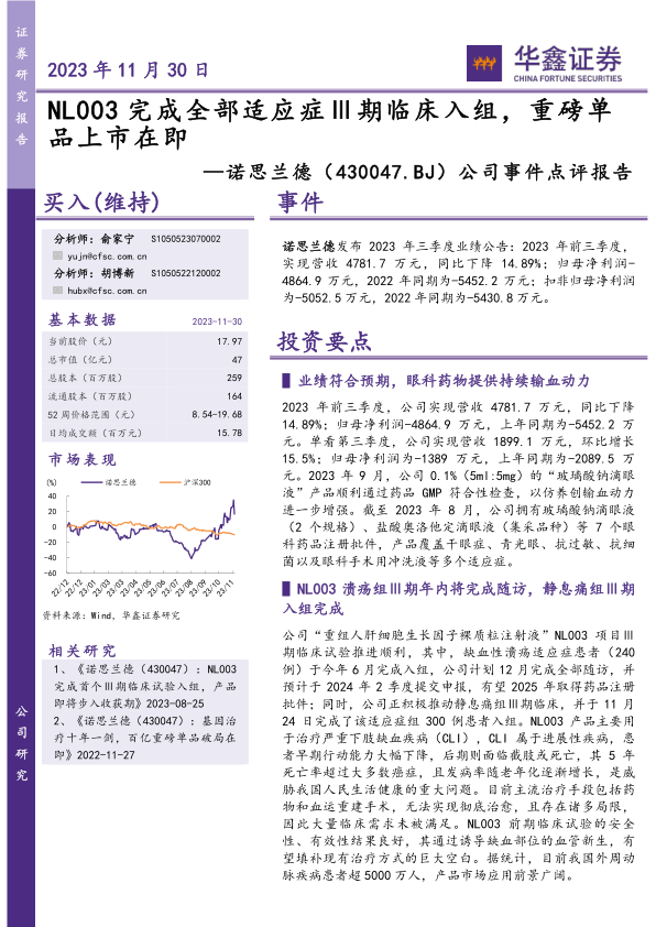 公司现有眼科药物业务表现稳健,2023年前三季度营收虽同比略有下降,但第三季度环比增长15.5%,且归母净利润亏损同比收窄,显示出“以仿养创”的持续输血能力。为进一步加速创新药的商业化进程和研发投入,公司计划募资2.31亿元,其中大部分将用于NL003等核心产品的临床研究补充及生物工程新药产业化项目,旨在提升产能并增强创新药研发实力。公司拥有丰富的在研管线,覆盖基因治疗和重组蛋白质类药物,为长期发展奠定基础。