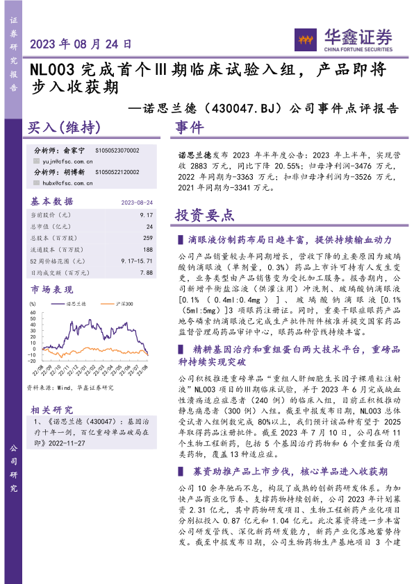 公司事件点评报告:NL003完成首个Ⅲ期临床试验入组,产品即将步入收获期