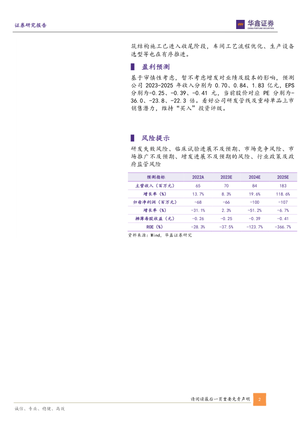 基于审慎性考虑,暂不考虑增发对业绩及股本的影响, 预测公司 2023-2025 年收入分别为 0.70、 0.84、 1.83 亿元, EPS分别为-0.25、 -0.39、 -0.41 元,当前股价对应 PE 分别为-36.0、 -23.8、 -22.3 倍。 看好公司研发管线及重磅单品上市销售潜力, 维持“买入” 投资评级。