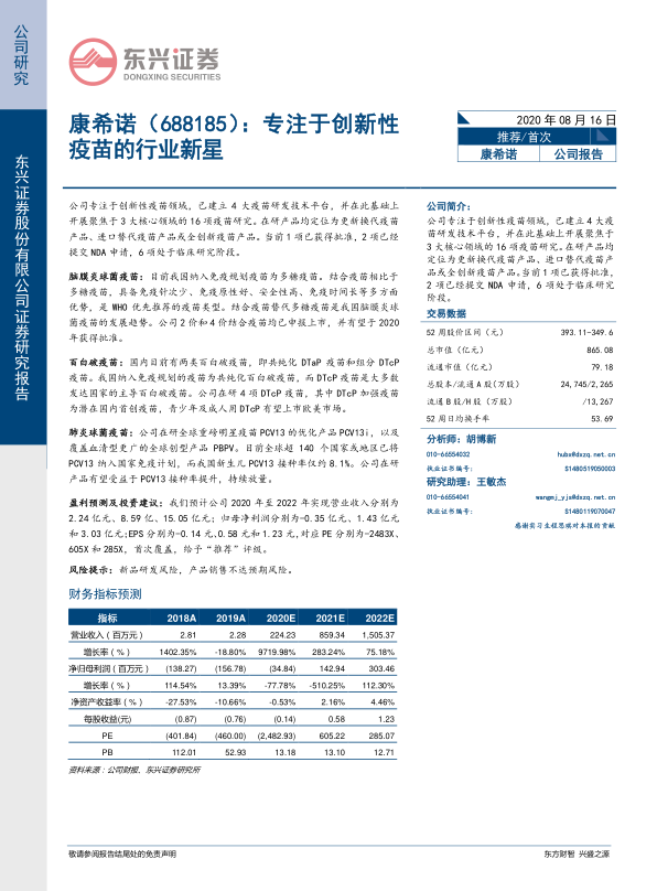 康希诺的核心产品管线中包含多款具有市场颠覆潜力的重磅疫苗。在脑膜炎球菌疫苗领域,其2价和4价结合疫苗有望于2020年获批上市,替代现有市场上的多糖疫苗;在百白破疫苗领域,公司在研的组分疫苗系列,特别是儿童加强疫苗和青少年及成人用疫苗,有望填补国内市场空白并进军欧美市场;在肺炎球菌疫苗领域,优化的13价结合疫苗和全球创新的蛋白疫苗将受益于中国不断提升的疫苗接种率。此外,公司在突发传染病领域的快速响应能力,尤其是在新冠疫苗研发方面的全球领先进展,进一步验证了其技术平台的实力。尽管公司当前处于高研发投入期,尚未实现稳定盈利,但预计随着核心产品的商业化,未来几年将迎来爆发式增长,其创新管线和广阔的市场前景使其获得“推荐”的投资评级。