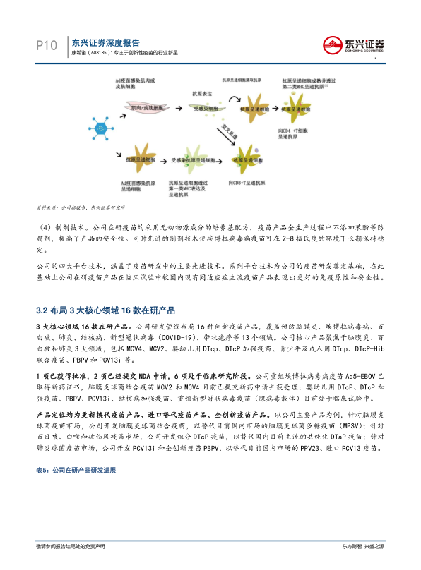 基于这些先进技术平台,康希诺逐步开展了聚焦于脑膜炎、百白破和肺炎三大核心领域的16款疫苗产品的研发。这些在研产品均定位为更新换代疫苗产品、进口替代疫苗产品或全创新疫苗产品,旨在解决现有疫苗的不足或填补市场空白。目前,公司重组埃博拉病毒病疫苗Ad5-EBOV已获得新药证书,脑膜炎球菌结合疫苗MCV2和MCV4已提交新药申请并获受理,婴幼儿用DTcP、DTcP加强疫苗、PBPV、PCV13i、结核病加强疫苗、重组新型冠状病毒疫苗(腺病毒载体)等6项产品处于临床试验阶段。