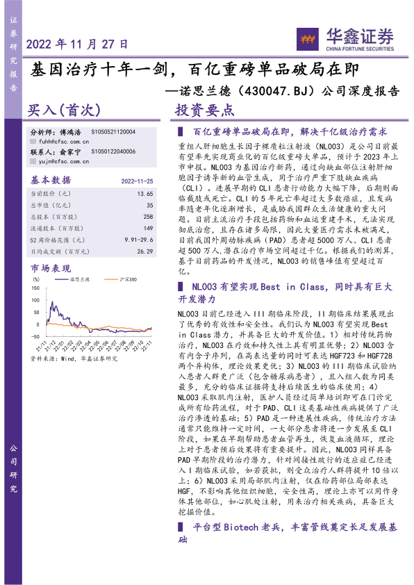 本报告对诺思兰德进行了深入分析,认为公司凭借其在基因治疗领域的领先地位和重磅产品 NL003 的巨大潜力,具备显著的投资价值。NL003 有望解决 CLI 这一巨大的未满足医疗需求,成为百亿级重磅单品。同时,公司丰富的管线和成熟的技术平台也为未来的持续增长奠定了基础。首次覆盖,给予“买入”评级。