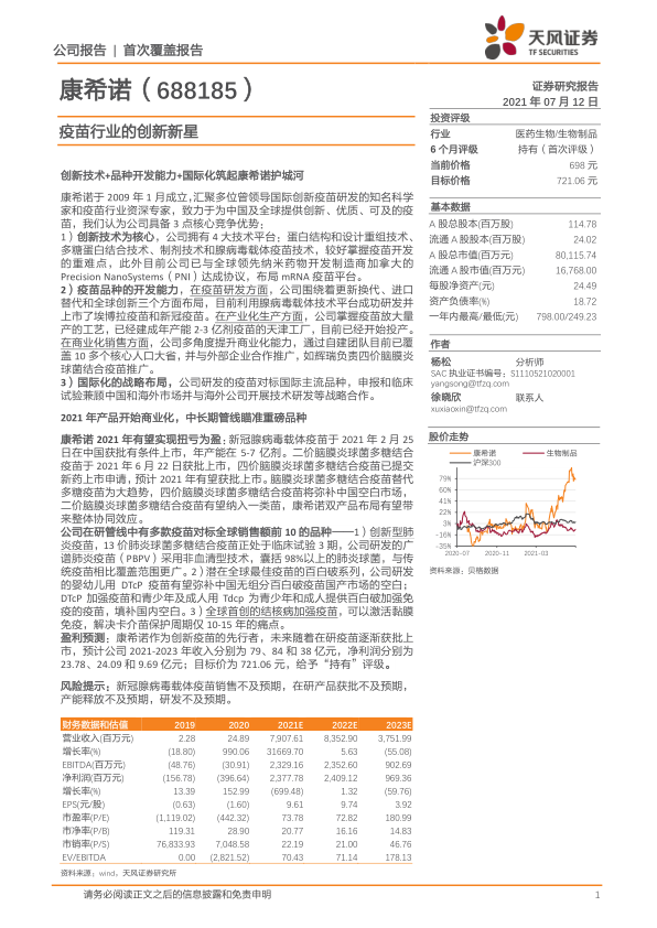 盈利预测:康希诺作为创新疫苗的先行者,未来随着在研疫苗逐渐获批上市,预计公司 2021-2023 年收入分别为 79、84 和 38 亿元,净利润分别为23.78、24.09 和 9.69 亿元;目标价为 721.06 元,给予“持有”评级。