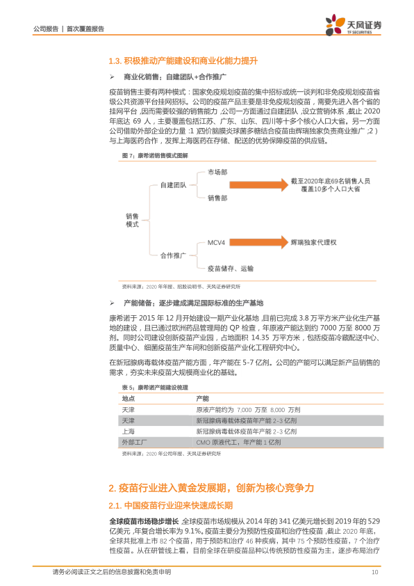 2)疫苗品种的开发能力,在疫苗研发方面,公司围绕着更新换代、进口替代和全球创新三个方面布局,目前利用腺病毒载体技术平台成功研发并上市了埃博拉疫苗和新冠疫苗。在产业化生产方面,公司掌握疫苗放大量产的工艺,已经建成年产能 2-3 亿剂疫苗的天津工厂,目前已经开始投产。在商业化销售方面,公司多角度提升商业化能力,通过自建团队目前已覆盖 10 多个核心人口大省,并与外部企业合作推广,如辉瑞负责四价脑膜炎球菌结合疫苗推广。