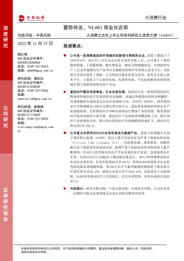 本报告对诺思兰德公司进行了深入分析,认为公司是一家深耕基因治疗领域的创新型生物制药企业,具备较强的研发实力和市场潜力。随着基因治疗行业的快速发展和 NL003 等核心产品的逐步商业化,诺思兰德有望在未来取得更大的发展。但同时也应关注新药研发的风险,以及市场竞争带来的挑战。