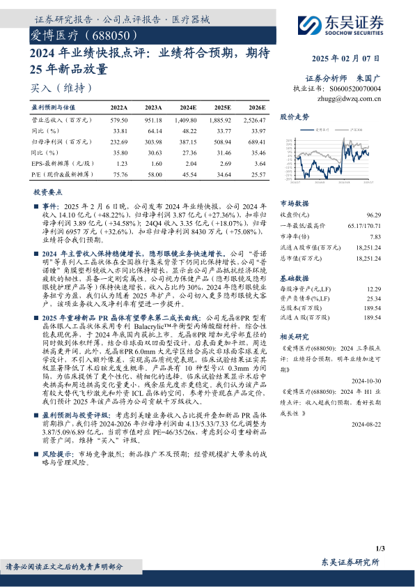 爱博医疗2024年业绩符合预期,主营业务稳健增长,尤其隐形眼镜业务表现亮眼。龙晶®PR晶体作为重磅新品,有望成为公司新的增长点。维持“买入”评级,但需关注市场竞争、新品推广以及经营规模扩大带来的风险。