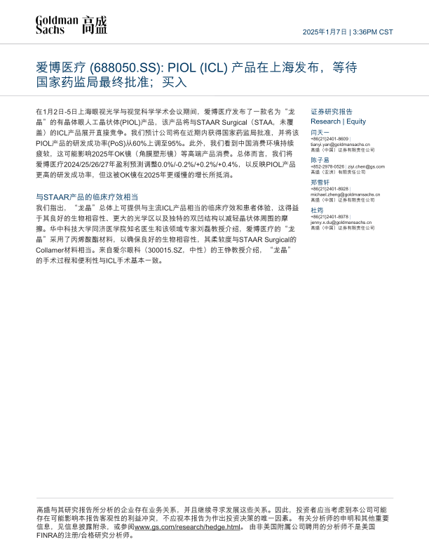 2025年1月7日,爱博医疗在上海眼视光学与视觉科学学术会议期间发布了其有晶体眼人工晶状体(PIOL)产品“龙晶”。该产品旨在与STAAR Surgical(STAA)的ICL产品展开直接竞争。高盛预计公司将在近期内获得国家药监局批准,并将“龙晶”PIOL产品的研发成功率(PoS)从60%上调至95%。