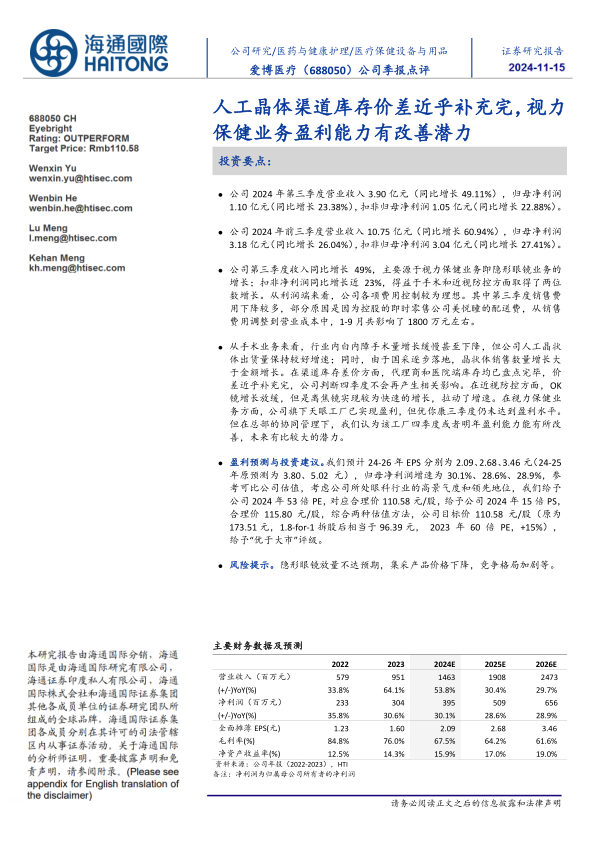 公司第三季度收入同比增长49%,主要源于视力保健业务即隐形眼镜业务的增长;扣非净利润同比增长近23%,得益于手术和近视防控方面取得了两位数增长。从利润端来看,公司各项费用控制较为理想。其中第三季度销售费用下降较多,部分原因是因为控股的即时零售公司美悦瞳的配送费,从销售费用调整到营业成本中,1-9月共影响了1800万元左右。