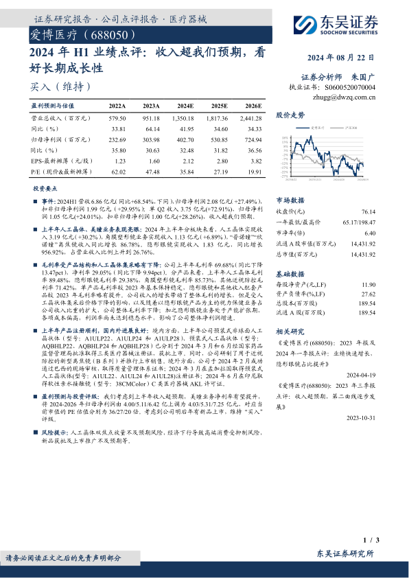 爱博医疗2024年上半年业绩表现强劲,营业收入和净利润均实现显著增长,其中隐形眼镜(美瞳)业务的爆发式增长成为主要亮点,推动公司收入超预期。尽管受人工晶体集采和产品结构变化影响,公司整体毛利率有所下降,但核心产品毛利率保持稳定,且公司在国内外市场拓展和新产品注册方面取得了积极进展。分析师基于上半年强劲表现和对未来新品上市的预期,上调了盈利预测并维持“买入”评级,看好公司长期成长性,但同时提示了相关市场和产品风险。