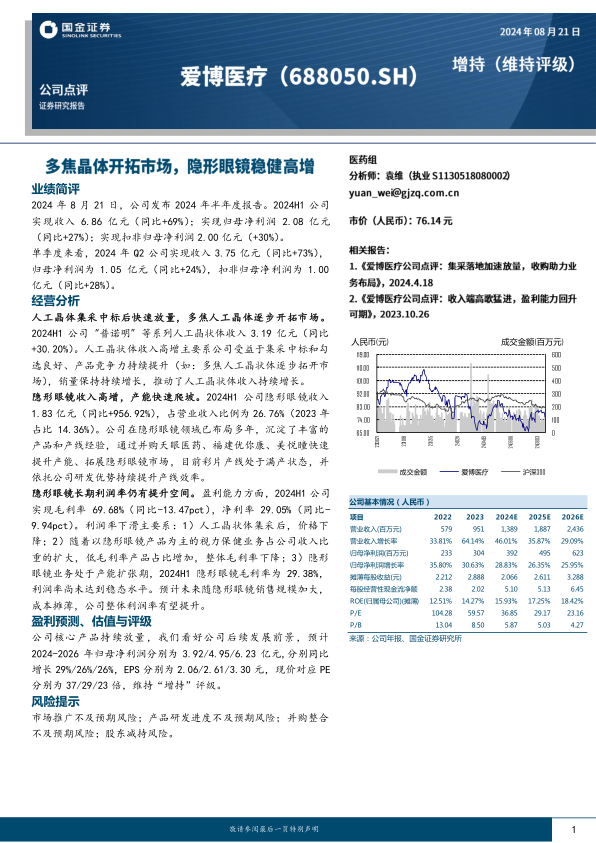 2024年上半年,公司凭借人工晶体业务的稳健增长和隐形眼镜业务的爆发式扩张,实现了营收和净利润的强劲增长。尽管短期内产品结构变化导致整体利润率有所承压,但隐形眼镜业务的快速发展和产能提升为公司带来了新的增长动力和长期盈利潜力。展望未来,随着隐形眼镜业务规模效应的显现和成本的优化,公司整体盈利能力有望逐步改善。综合各项数据和业务发展态势,公司未来发展前景积极,维持“增持”评级,但投资者仍需关注市场推广、产品研发、并购整合及股东减持等潜在风险。