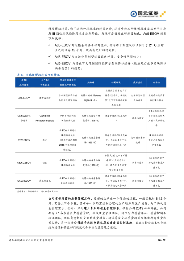 2020年初,COVID-19疫情在全球大流行,疫苗的重要性不断提高。康希诺与军事科学院军事医学研究院生物工程研究所联合开发的重组新型冠状病毒疫苗(腺病毒载体)「Ad5-nCoV」已获批进入临床试验,研发进度全球领先。I期临床预计2020年年底结束,主要进行安全性和剂量爬坡。该疫苗基于公司成熟的腺病毒载体技术,该技术已成功应用于埃博拉疫苗Ad5-EBOV的研发,具有安全性好、可同时诱导体液免疫和细胞免疫的优势。埃博拉疫苗的临床数据显示其整体安全性和免疫原性良好,为新冠疫苗的研发提供了坚实基础。