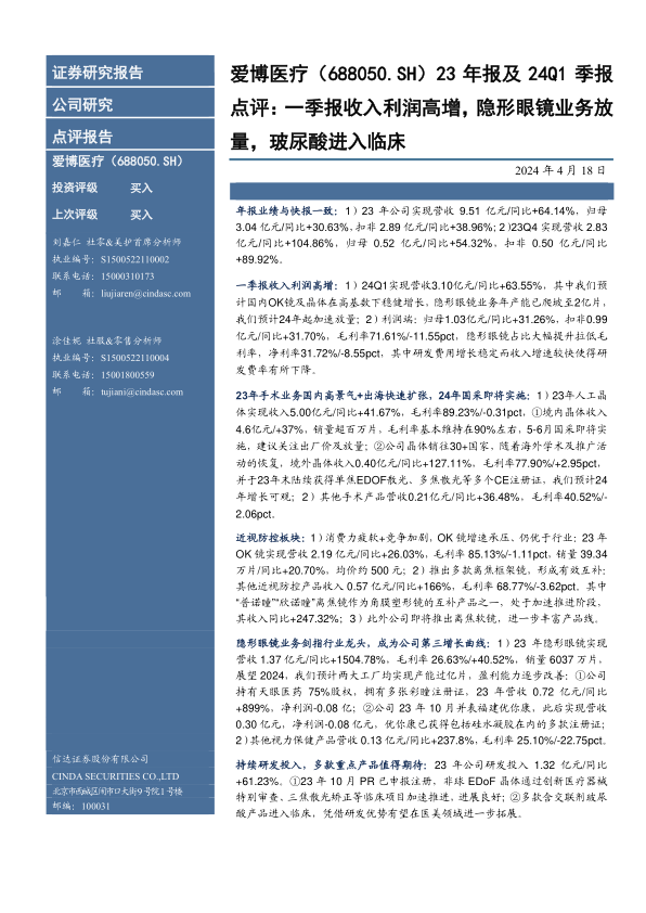 23年报及24Q1季报点评:一季报收入利润高增,隐形眼镜业务放量,玻尿酸进入临床