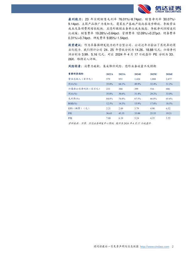 投资建议:作为具备强研发能力的平台型公司,公司近年亦验证了其优异的商业化能力。我们预计公司24、25年营收分别为14.26、18.88亿元;归母净利润分别为3.99、5.16亿元,对应2024年4月17日收盘价PE分别为33、26X,维持买入评级。