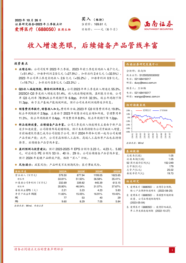 本报告分析了爱博医疗2023年三季报,指出公司收入端表现亮眼,但盈利能力受产能爬坡影响有所下降。公司加大了销售投入,新产品(尤其是美瞳)逐渐放量,未来增长潜力可期。维持“买入”评级,但需关注政策、研发和医疗事故等风险。