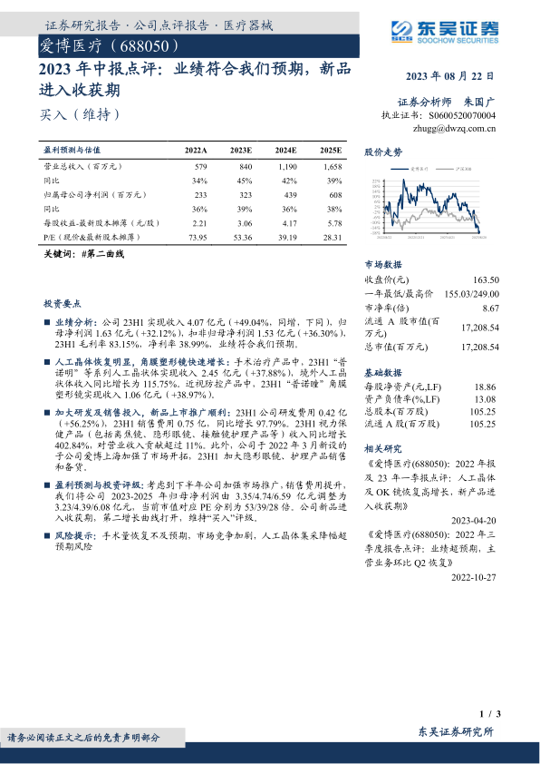 爱博医疗2023年中报显示,公司业绩符合预期,主要得益于人工晶体业务的恢复和角膜塑形镜业务的快速增长。同时,公司加大研发和销售投入,推动新品上市,为未来的增长奠定基础。