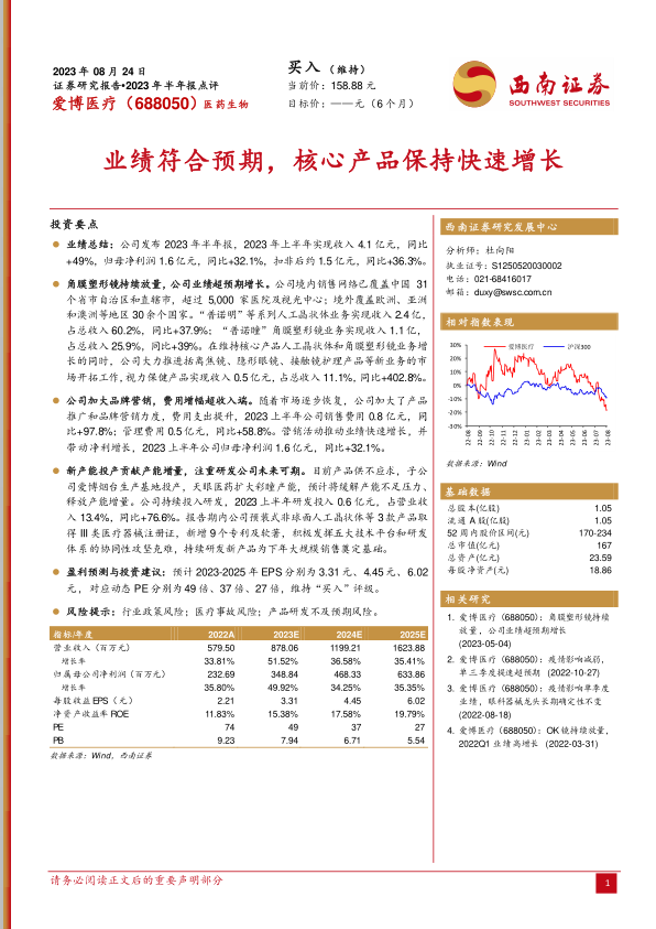 爱博医疗2023年上半年业绩表现良好,核心产品保持快速增长势头,新业务拓展取得显著进展。公司通过加大市场投入、扩张产能和持续研发,为未来发展奠定了坚实基础。维持“买入”评级,但需关注行业政策、医疗事故和研发风险。