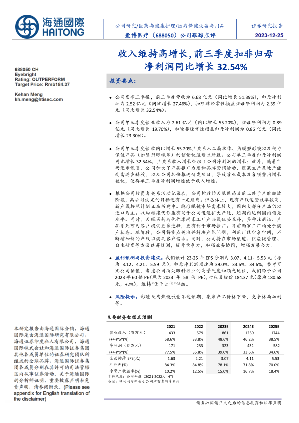 盈利预测与投资建议。我们预计23-25年EPS分别为3.07、4.11、5.53元(原为3.12、4.21、5.59元),归母净利润增速为39.0%、33.6%、34.6%,参考可比公司估值,考虑公司所处眼科行业的高景气度和领先地位,我们给予公司2023年60倍PE(原为2023年58倍PE),对应目标价184.37元(原为180.68元,+2%),维持“优于大市”评级。
