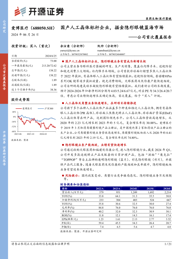 公司主营业务为眼科医疗器械的研发、生产及销售,覆盖白内障手术、近视防控和视光消费三大领域。白内障手术领域,公司首款非球面衍射型多焦人工晶状体于2022年获批,有晶体眼人工晶状体有望陆续获批。近视防控领域,普诺瞳?Pro系列OK镜等逐步获批放量。视光消费领域,天眼医药及优你康产能快速爬坡,公司自研的高透氧硅水凝胶隐形眼镜有望陆续获批。我们看好公司的长期发展,预计2024-2026年归母净利润分别为4.03/5.24/6.67亿元,对应PE为34.3/26.4/20.7倍,考虑公司业绩快速增长且确定性高,首次覆盖,给予“买入”评级。