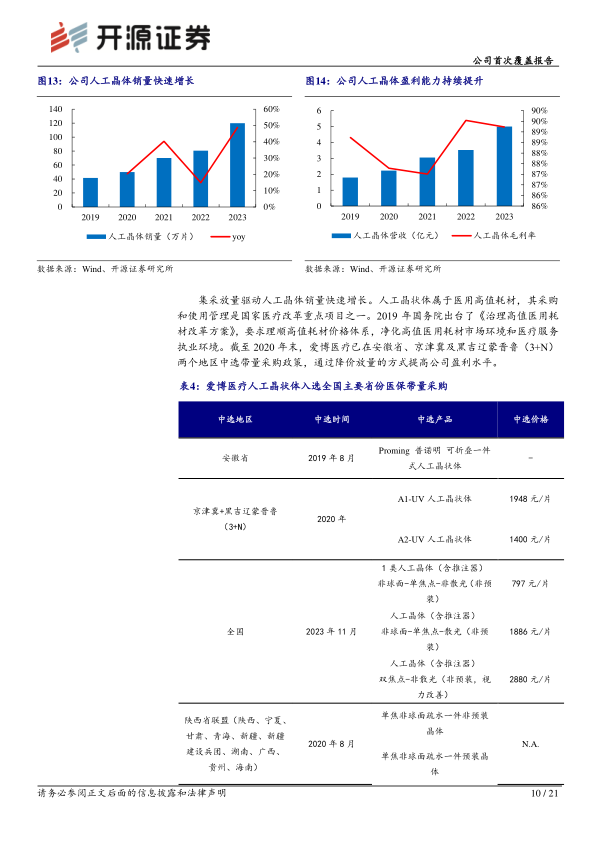 集采政策是驱动人工晶体销量快速增长的重要因素。爱博医疗已在安徽省、京津冀及黑吉辽蒙晋鲁(3+N)等多个地区中选带量采购,通过降价放量的方式提高了市场份额和盈利水平。公司在研项目丰富,包括有晶体眼人工晶状体(PR晶体)、非球面三焦散光矫正人工晶状体、非球面扩景深(EDoF)人工晶状体等,均达到国际领先水平,有望进一步巩固公司在高端人工晶体市场的地位。
