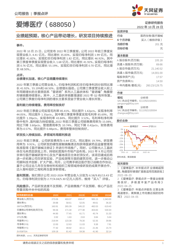 爱博医疗2022年第三季度业绩表现强劲,核心产品销量增长是主要驱动力。公司盈利能力持续增强,费用控制良好。同时,公司不断加大研发投入,积极拓展国内外市场,并积极布局新领域。维持“买入”评级。