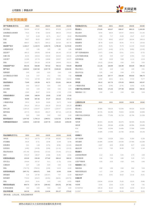 盈利预测:我们预计公司2022-2024年营业收入分别为6.58/9.85/13.43亿元,归母净利润分别为2.77/4.04/5.30亿元人民币,维持“买入”评级。