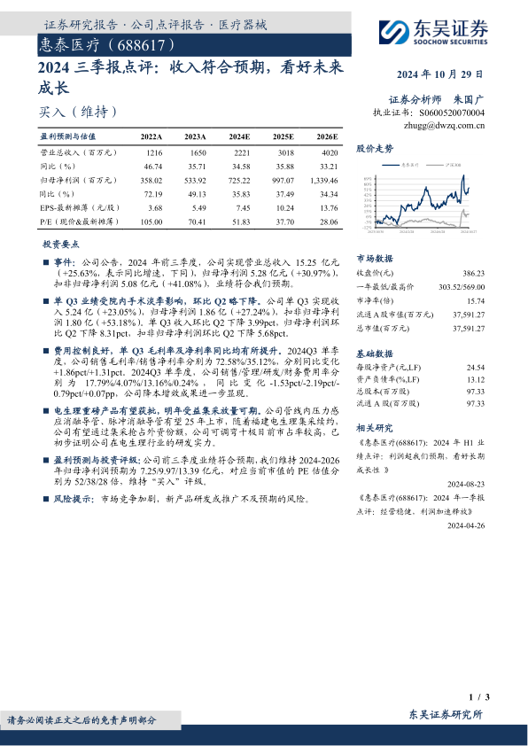 惠泰医疗2024年前三季度业绩符合预期,收入同比增长25.63%,归母净利润增长30.97%。公司在费用控制方面表现良好,毛利率和净利率同比均有所提升。