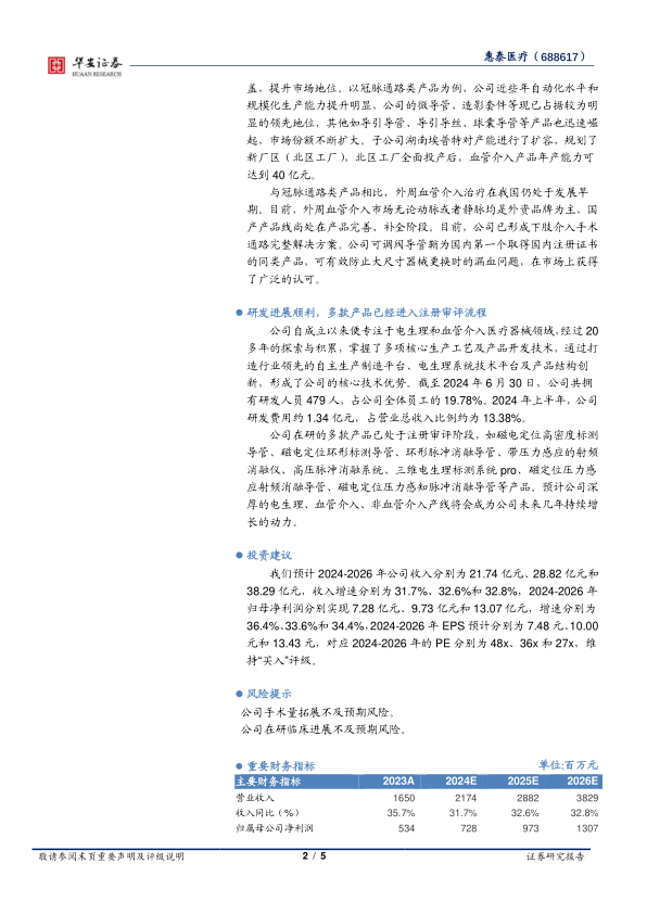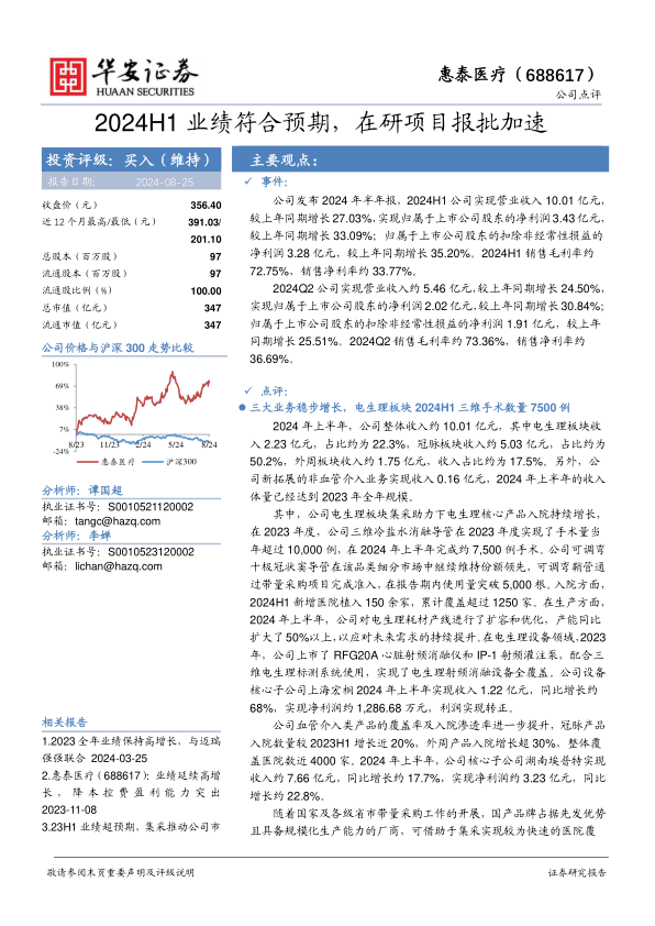 本报告对惠泰医疗2024年半年度业绩进行了分析,并维持“买入”评级。核心观点如下: