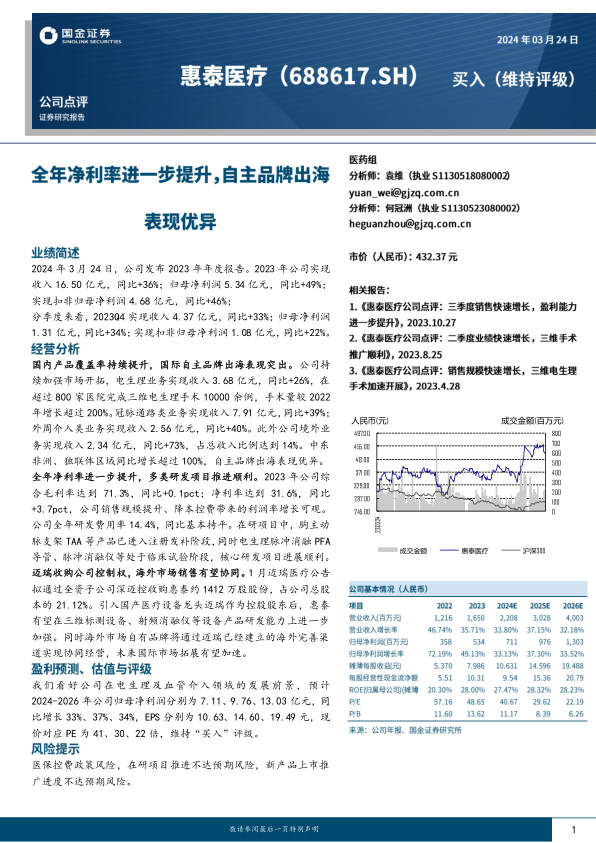 本报告分析了惠泰医疗2023年年度报告,指出公司在营收和净利润方面均实现了显著增长,这主要得益于其在国内市场覆盖率的提升以及国际自主品牌出海的成功。公司在电生理和血管介入领域持续加强市场开拓,手术量和入院数量均大幅增长。此外,迈瑞医疗收购公司控制权,有望在研发和海外市场销售方面产生协同效应,加速国际市场拓展。报告维持“买入”评级,并预计未来几年公司归母净利润将保持快速增长。同时,报告也提示了医保控费政策、在研项目推进以及新产品推广等方面的风险。