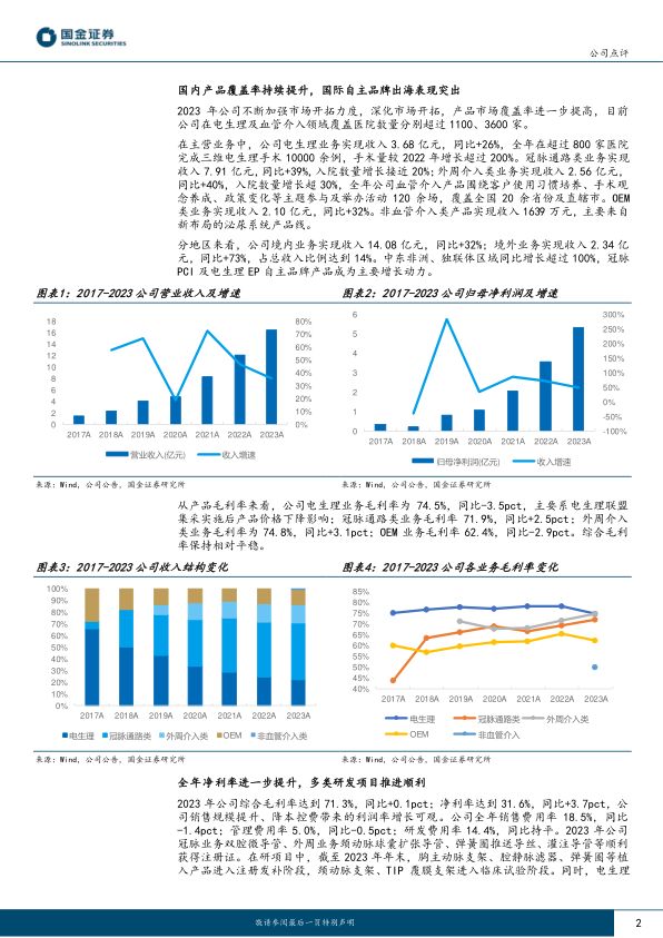 国内产品覆盖率持续提升,国际自主品牌出海表现突出。公司持续加强市场开拓,电生理业务实现收入3.68亿元,同比+26%,在超过800家医院完成三维电生理手术10000余例,手术量较2022年增长超过200%。冠脉通路类业务实现收入7.91亿元,同比+39%;外周介入类业务实现收入2.56亿元,同比+40%。此外公司境外业务实现收入2.34亿元,同比+73%,占总收入比例达到14%。中东非洲、独联体区域同比增长超过100%,自主品牌出海表现优异。全年净利率进一步提升,多类研发项目推进顺利。2023年公司综合毛利率达到71.3%,同比+0.1pct;净利率达到31.6%,同比+3.7pct,公司销售规模提升、降本控费带来的利润率增长可观。公司全年研发费用率14.4%,同比基本持平。在研项目中,胸主动脉支架TAA等产品已进入注册发补阶段,同时电生理脉冲消融PFA导管、脉冲消融仪等处于临床试验阶段,核心研发项目进展顺利。迈瑞收购公司控制权,海外市场销售有望协同。1月迈瑞医疗公告拟通过全资子公司深迈控收购惠泰约1412万股股份,占公司总股本的21.12%。引入国产医疗设备龙头迈瑞作为控股股东后,惠泰有望在三维标测设备、射频消融仪等设备产品研发能力上进一步加强。同时海外市场自有品牌将通过迈瑞已经建立的海外完善渠道实现协同经营,未来国际市场拓展有望加速。