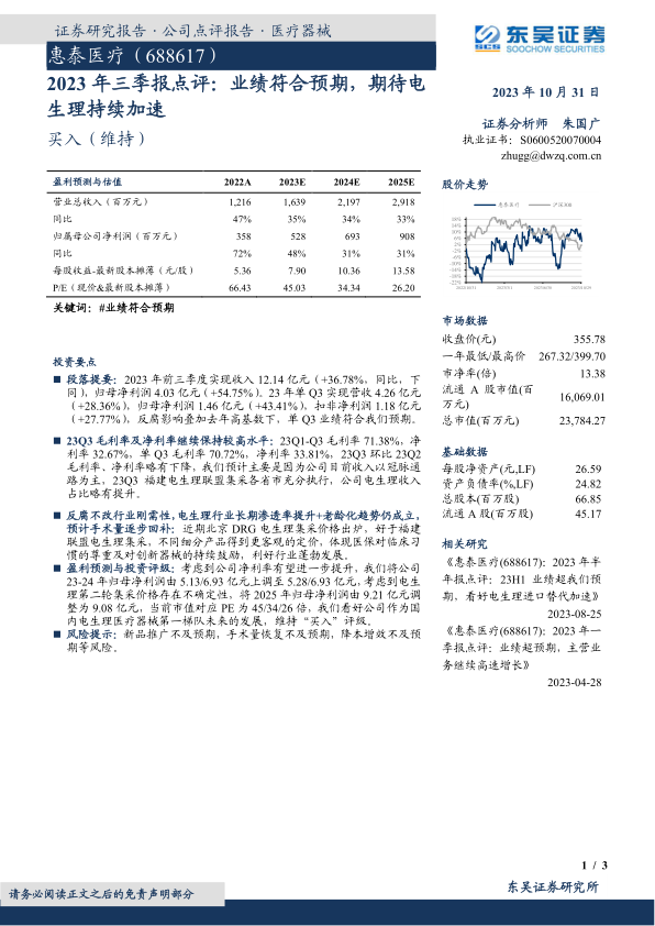 惠泰医疗2023年前三季度业绩表现稳健,第三季度在行业调整和高基数背景下仍实现符合预期的增长。公司在冠脉通路和电生理领域保持了较高的盈利能力。展望未来,尽管面临集采等政策性挑战,但电生理行业的刚需性、长期渗透率提升和老龄化趋势为公司提供了坚实的增长基础。北京DRG电生理集采的积极信号也预示着医保政策对创新器械的持续支持。分析师基于对公司盈利能力的乐观预期,上调了2023-2024年归母净利润预测,并维持“买入”评级,肯定了公司作为国内电生理医疗器械领先企业的市场地位和发展潜力。