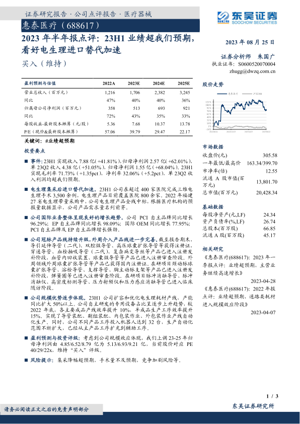 考虑到公司规模效应的逐步体现,分析师上调了惠泰医疗2023年至2025年的归母净利润预测,分别由原先的4.85亿元、6.52亿元、8.79亿元上调至5.13亿元、6.93亿元、9.21亿元。当前股价对应的市盈率(PE)分别为40倍、29倍和22倍。