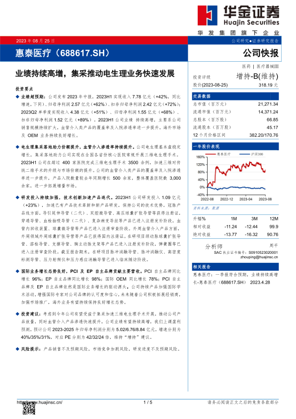 投资建议:考虑到今年公司有望受益于集采加速三维电生理手术开展,推动公司产品放量,同时血管介入产品渗透快速提升,公司业绩有望持续高增,我们上调盈利预测,预计公司2023-2025年归母净利润分别为5.02/6.76/8.84亿元,增速分别为40%/35%/31%,对应PE分别为42/32/24倍,维持“增持”建议。