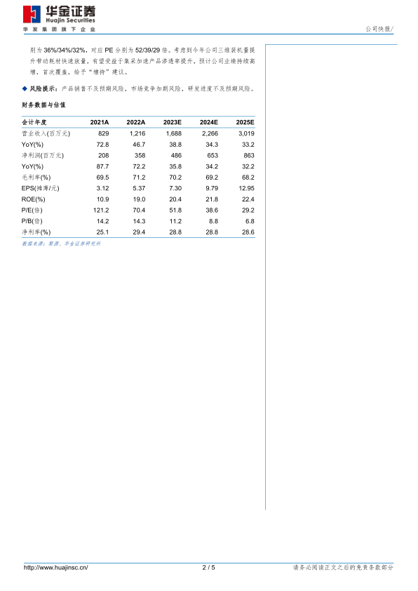 投资建议:预测公司2023-2025年归母净利润分别为4.86/6.53/8.63亿元,增速分别为36%/34%/32%,对应PE分别为52/39/29倍。考虑到今年公司三维装机量提升带动耗材快速放量,有望受益于集采加速产品渗透率提升,预计公司业绩持续高增,首次覆盖,给予“增持”建议。