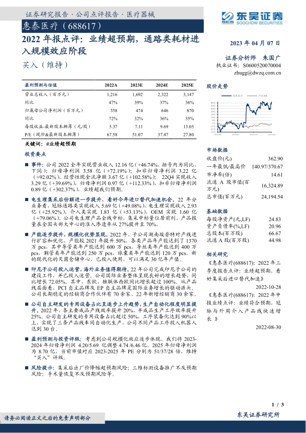 惠泰医疗在2022年展现了卓越的经营业绩,营业收入和归母净利润均实现高速增长,远超市场预期。公司通过电生理集采成功扩大了市场份额,并凭借产能的显著提升和生产自动化水平的提高,有效发挥了规模效应。此外,国际业务的成功拓展,特别是印尼子公司的投入运营和东欧、独联体及西欧市场的强劲增长,为公司未来的全球化发展奠定了基础。鉴于公司持续的创新能力、稳健的盈利能力和广阔的市场前景,分析师对其未来增长潜力持乐观态度,并维持“买入”评级。