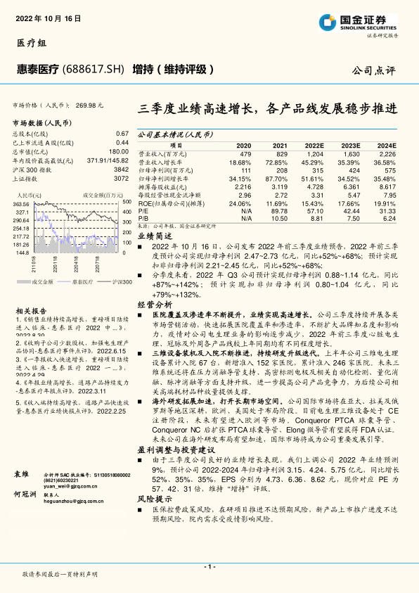 由于三季度公司良好的业绩增长表现,我们上调公司2022年业绩预测9%,预计公司2022-2024年归母净利润3.15、4.24、5.75亿元,同比增长52%、35%、35%,EPS分别为4.73、6.36、8.62元,现价对应PE为57、42、31倍,维持“增持”评级。